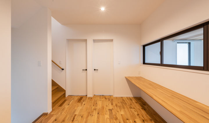 キッチンと接したカウンターダイニング、オープンのカップボード、アクセントとなるブラックと床材が、おしゃれな飲食店のような雰囲気です。また、LDKの作業スペースは、団らんの様子を感じながらも、落ち着いて集中できるような場所となりそうです。